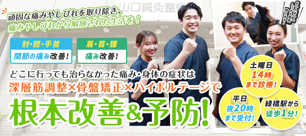 東成区にある山口鍼灸整骨院は、地下鉄中央線「緑橋駅」から歩いて直ぐで通院に便利です。日常的に悩まれている、慢性的な腰痛・肩こり・頭痛・膝痛・神経痛症状に対し整体・骨盤矯正・猫背矯正・鍼灸治療を行っていきます。むちうち症状などの交通事故治療も得意としております。